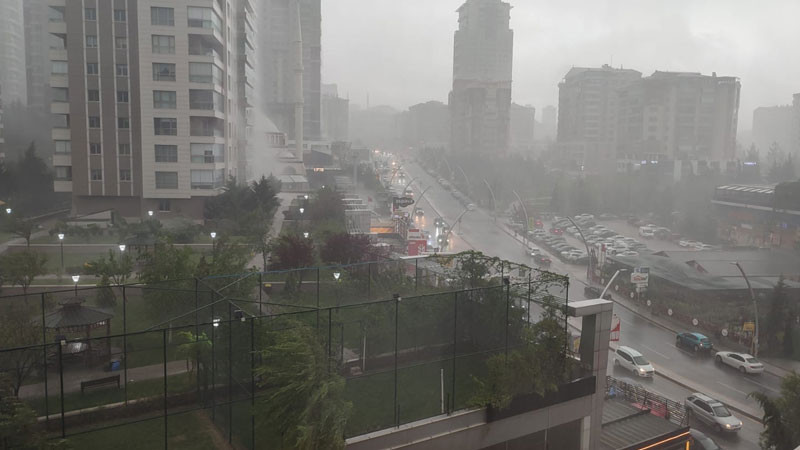Valiliğin 16.38'de yaptığı açıklama sonrası Ankara'da kısa sürede şiddetli yağmur etkili oldu. Kısa süreli yağışta ağaçlar fırtına nedeniyle savrulurken yağmuru sokakta yakalanan vatandaşlar kendilerini yağmurdan korumak için çaba sarf etti.