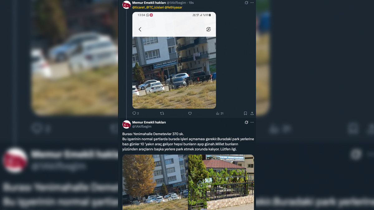 Kullanıcı, “Normal şartlarda burada işyeri açmaması gerekir. Bazı günler 10’a yakın araç geliyor, millet başka yerlere park etmek zorunda kalıyor” ifadeleriyle Ticaret Bakanlığı, İçişleri Bakanlığı, Yenimahalle Belediye Başkanı Fethi Yaşar'ı etiketleyerek yetkililere çağrı yaptı.