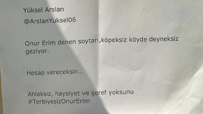 Yüksel Arslan, 2023 yılında yaptığı ve dokunulmazlık davasına açılmasına sebep olan paylaşımını da Yeni Ankara'ya açıkladı. Arslan, 29 Ekim 2023'te Onur Erim'i hedef alan bir paylaşım yaparak "Onur Erim denen soytarı,köpeksiz köyde deyneksiz geziyor. Hesap vereceksin… Ahlaksız, haysiyet ve şeref yoksunu." ifadelerine yer vermişti.