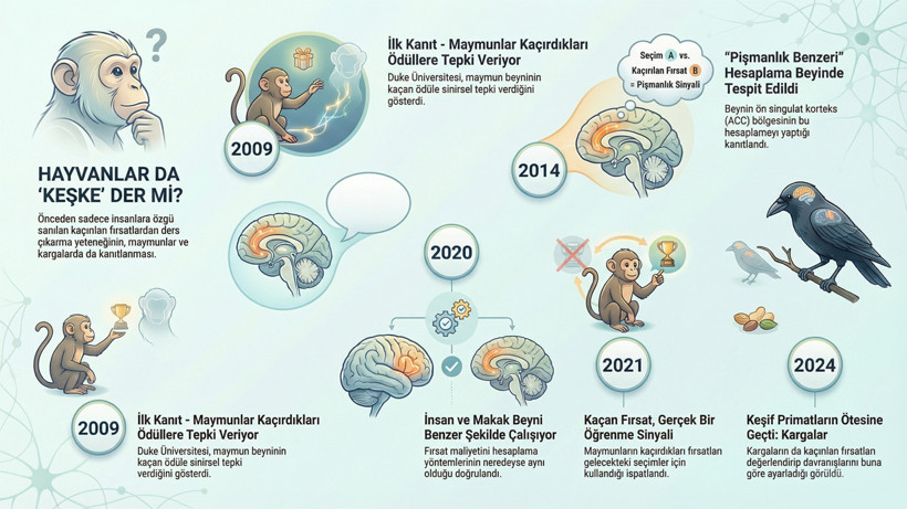 Bilim insanlarının 2009’da ilk kez ortaya koyduğu “maymunlar hatalarından tıpkı insanlar gibi ders çıkarıyor” bulgusu, aradan geçen yıllar içinde çok daha geniş ve güçlü araştırmalarla doğrulandı. Duke Üniversitesi'nden Ben Hayden ve ekibinin Science dergisinde yayımlanan öncü çalışması, maymun beyninin bir ödül kazandığında olduğu kadar, kaçırdığı ödül gösterildiğinde de belirgin bir sinirsel tepki verdiğini ortaya koymuştu. Bu tepkinin şiddeti, “ödül ne kadar büyükse, sinirsel yanıt da o kadar güçlü” ilkesini açık biçimde doğruluyordu.