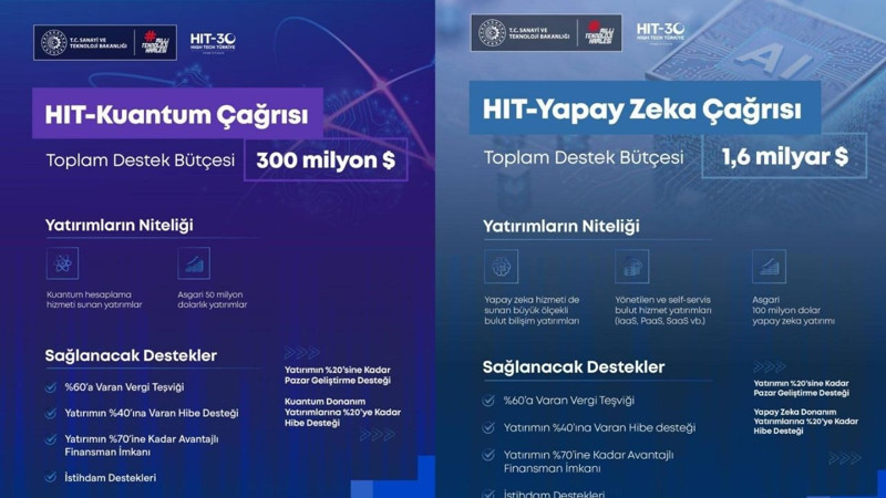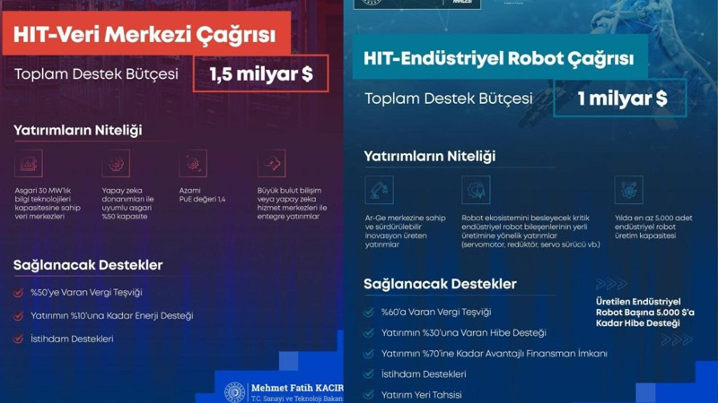 Sanayi ve Teknoloji Bakanı Mehmet Fatih Kacır, HIT-30 Yüksek Teknoloji Yatırım Programı kapsamında veri merkezi, yapay zeka, kuantum ve endüstriyel robot alanlarında 4 yeni çağrıyı duyurdu. Programla 2030’a kadar 30 milyar dolarlık yüksek teknoloji yatırımı hedefleniyor.
