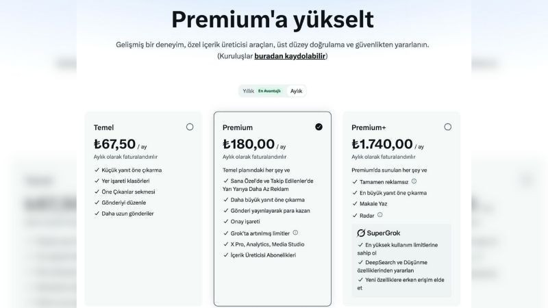 Platformda ayrıca yıllık faturalandırma seçeneğiyle sunulan üç farklı abonelik paketi yer alıyor. Temel plan, yıllık ödeme halinde aylık ortalama 49,84 TL’ye gelirken; Premium plan 130,83 TL, en kapsamlı seçenek olan Premium+ ise aylık ortalama bin 193 lira 33 kuruş olarak ücretlendiriliyor. Aylık ödeme tercih edildiğinde ise bu fiyatlar sırasıyla 67,50 TL, 180 TL ve bin 740 TL’ye yükseliyor.