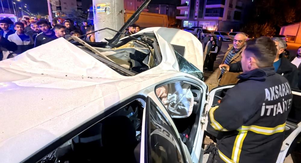 Aksaray’da otomobil elektrik direğine saplandı! Otomobil hurdaya döndü