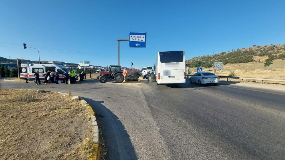 Kaza, sabah saatlerinde Kırıkkale'nin Yahşihan mevkiinde meydana geldi. Didim-Boğazlıyan seferini gerçekleştiren özel bir firmaya ait yolcu otobüsü ile traktör çarpıştı. Kırıkkale OSB kavşağında yaşanan çarpışmanın şiddetiyle römork devrilirken, otobüste bulunan şoför ve iki yolcu ise hafif yaralandı. İhbar üzerine kaza yerine gelen 112 ekipleri yaralılara ilk müdahaleyi yaptı. Hayati tehlikelerinin bulunmadığı öğrenilen yaralılar daha sonra çevredeki hastanelere sevk edildi.