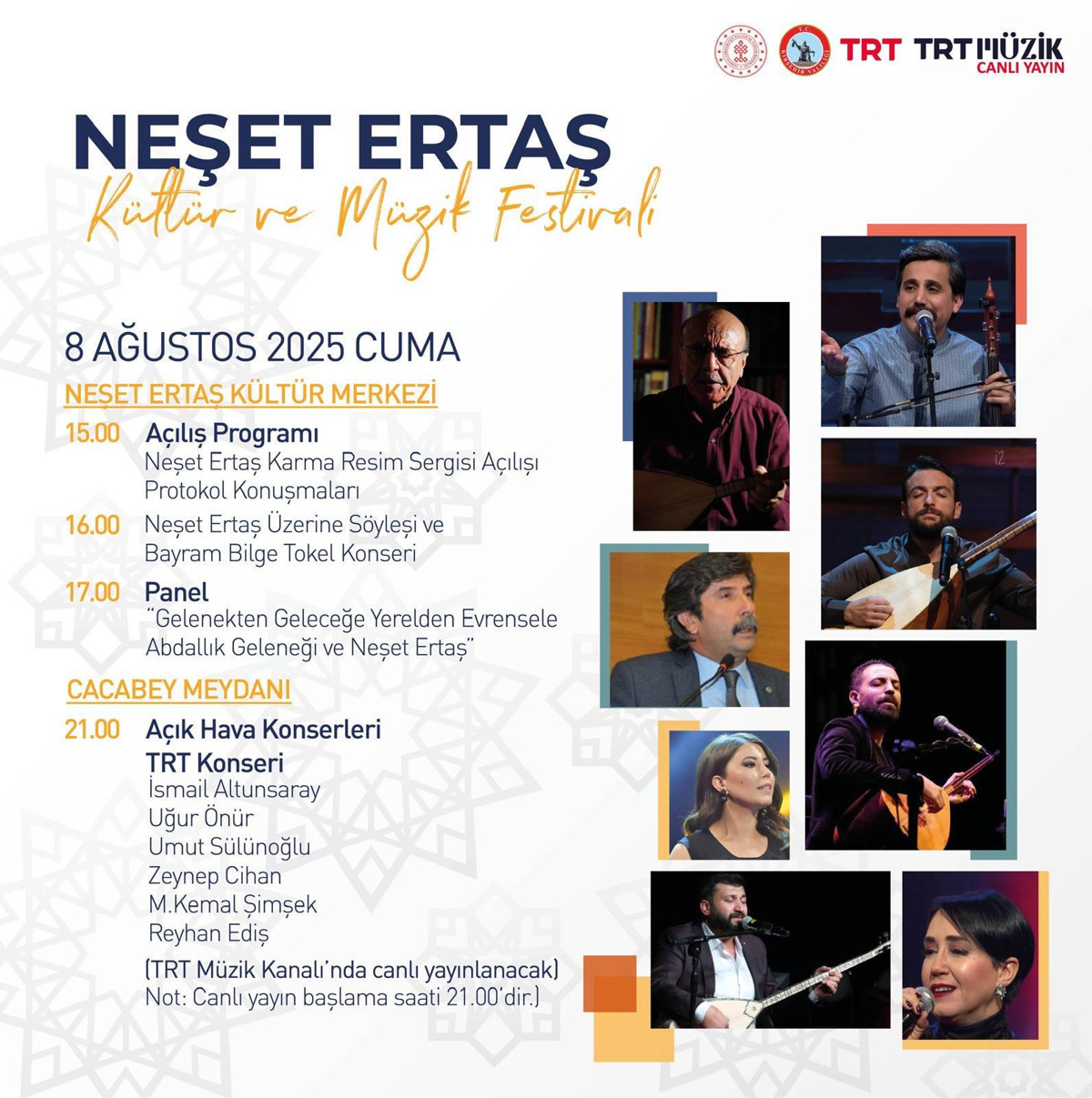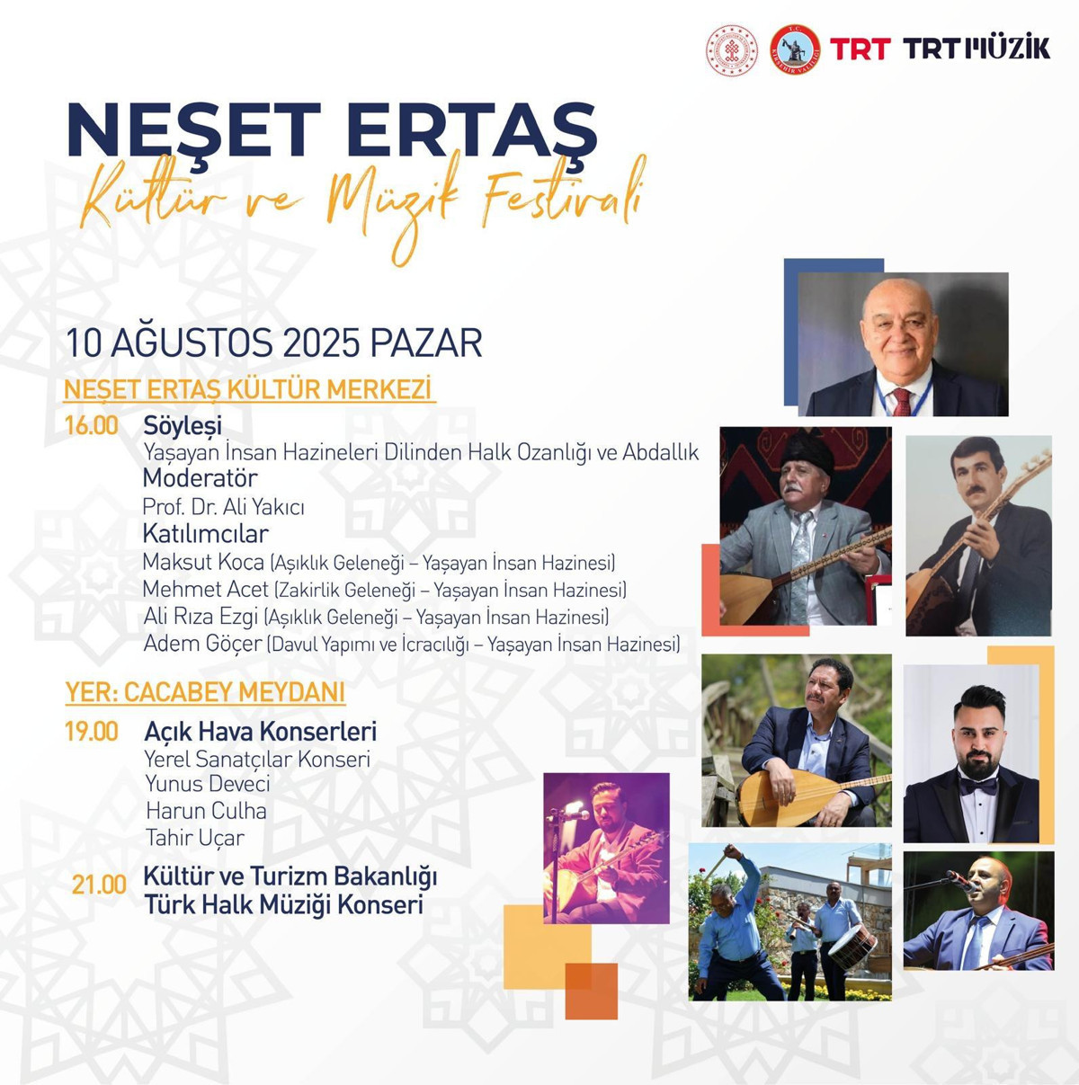 Kırşehir Valiliği tarafından bu yıl 8-10 Ağustos tarihlerinde düzenlenecek olan “Neşet Ertaş Kültür ve Müzik Festivali” için hazırlıklar tamamlandı. Festival, üç gün boyunca söyleşiler, paneller, konserler ve kültürel etkinliklerle müzikseverlere unutulmaz anlar yaşatacak.