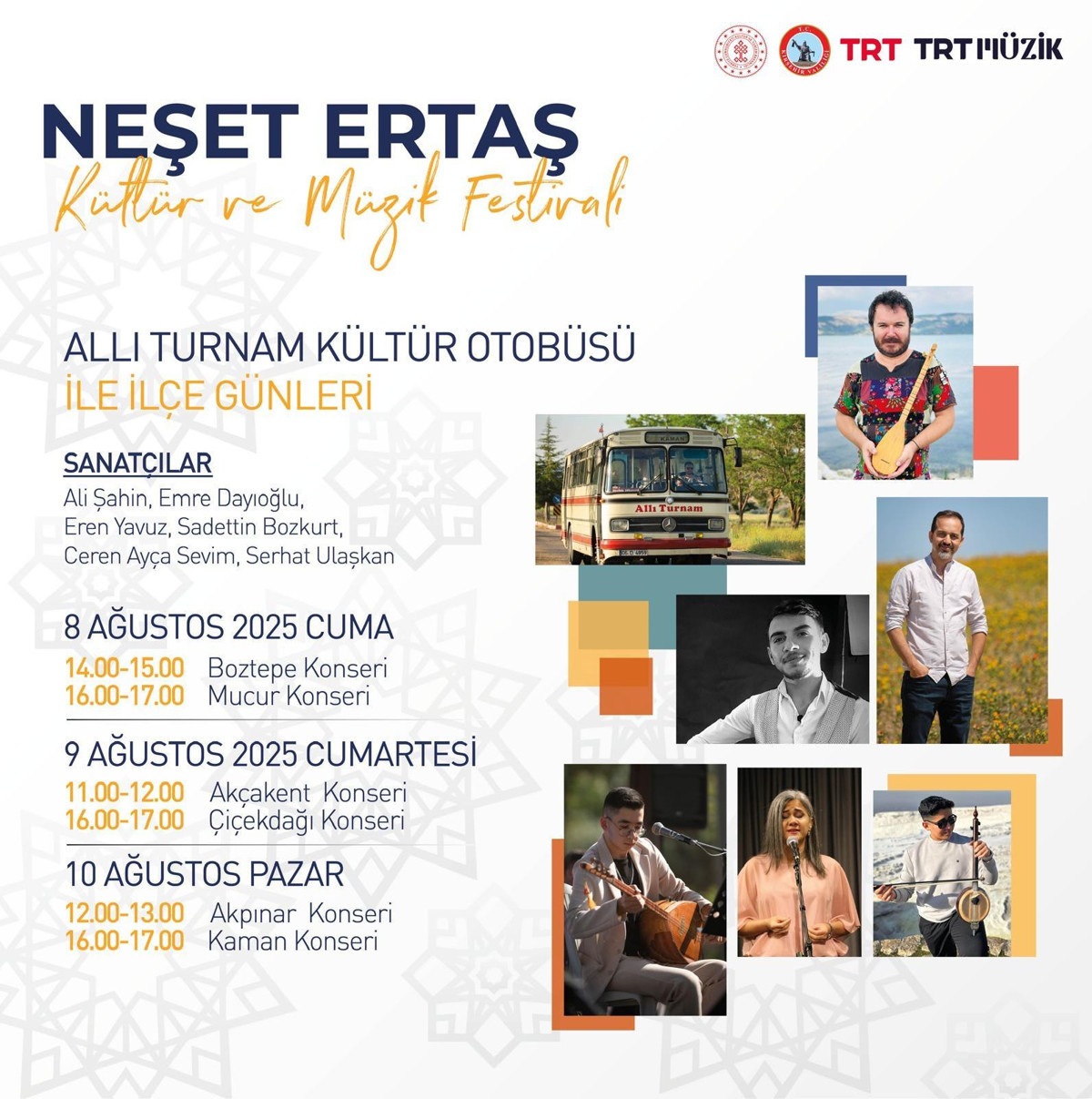 Allı Turnam Kültür Otobüsü ile İlçe Günleri kapsamında Boztepe, Mucur, Akçakent, Çiçekdağı, Akpınar ve Kaman’da konserler düzenlenecek.