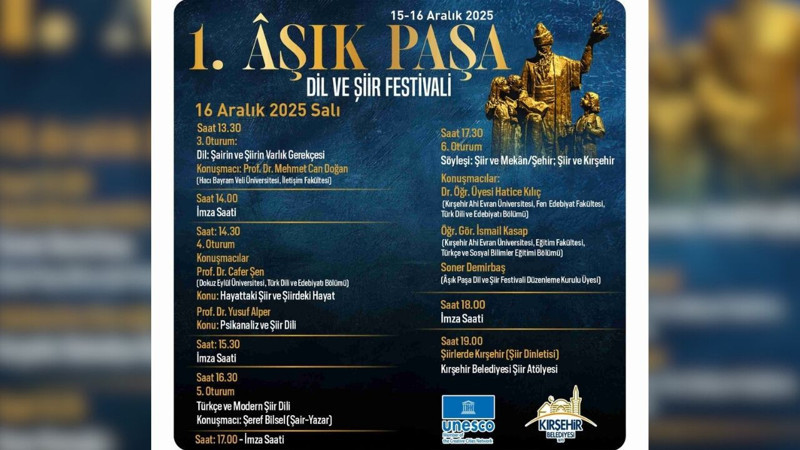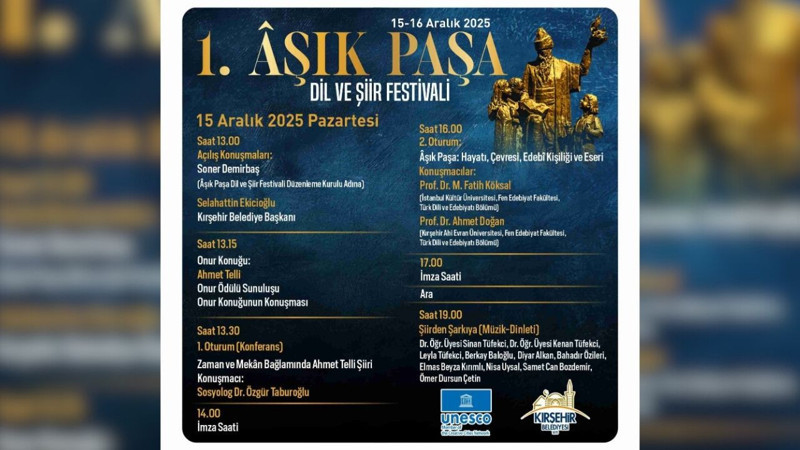 Kırşehir Belediyesi, UNESCO Yaratıcı Şehirler Ağı üyesi kimliğine yakışır bir etkinliğe imza atıyor. Şehrin tarihi ve kültürel zenginliğini ön plana çıkaracak olan 1. Aşık Paşa Dil ve Şiir Festivali, 15-16 Aralık 2025 tarihlerinde Neşet Ertaş Kültür Sanat Merkezi'nde düzenlenecek. Belediye tarafından sosyal medya hesapları üzerinden paylaşılan festival programı, edebiyat ve dilin başkenti Kırşehir'de iki gün sürecek yoğun bir sanat şöleninin sinyallerini verdi.