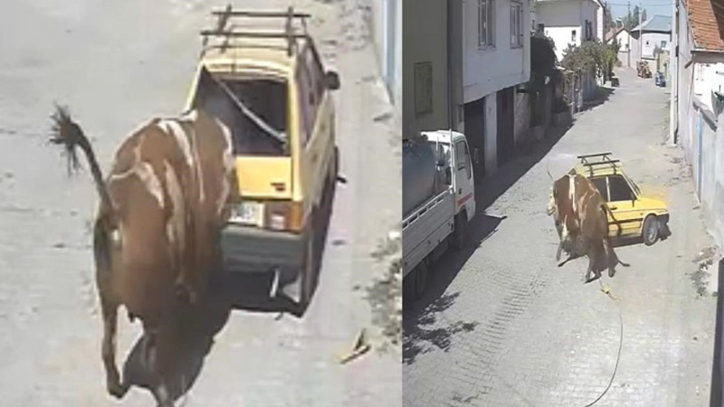 Boynuzları ile defalarca otomobile vuran boğa, sahipleri tarafından uyuşturucu iğne ile güçlükle sakinleştirildi. Ancak taşınmasının mümkün olmaması nedeniyle boğa, yakalandığı yerde kesildi.