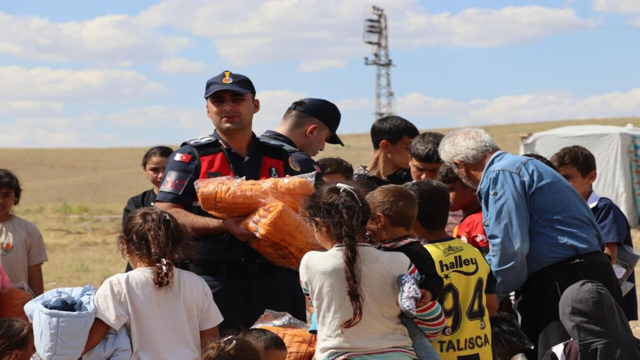 Yozgat’ın Yerköy ilçesine bağlı Sekili mevkiinde, mevsimlik tarım işçilerinin beraberindeki çocukları ziyaret eden Jandarma personeli oyuncak, kıyafet, ayakkabı ve battaniye dağıttı. Etkinlikte çocuklarla sohbet eden ekip, mutlu anlara ortak oldu.