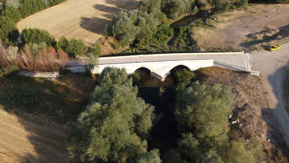 Yozgat'ta 2018 yılında aslına uygun restore edilen, aradan geçen beş asra rağmen varlığını korumaya devam eden Karabıyık Köprüsü, dronla görüntülendi.