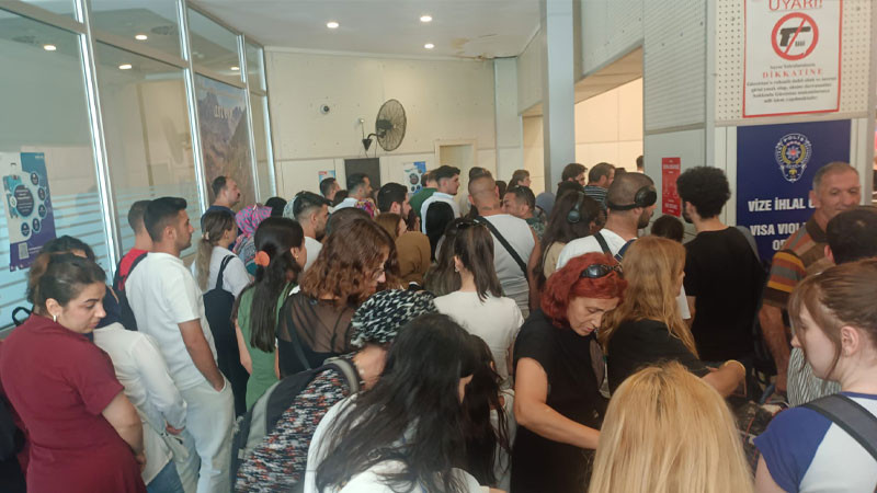 Vize süresini ihlal eden veya yurt dışı harcını yatırmayan bazı yolcular, işlemlerinde eksiklik nedeniyle bekledi. Ofis girişine asılan uyarı tabelasında, süresi dolmuş ikamet veya vize ihlali durumunda cezai işlemler uygulanacağı belirtilse de vatandaşların eksiklikleri ve personel azlığı bekleme süresinin artmasına neden oldu.