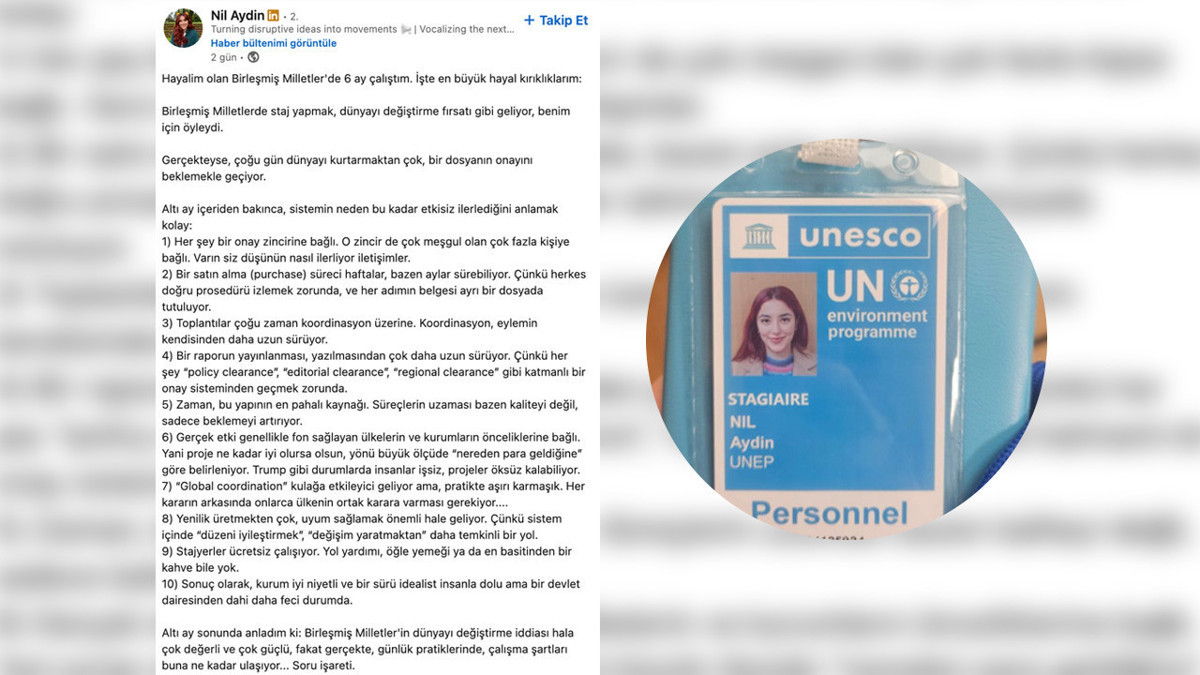 Birleşmiş Milletler’de altı ay staj yapan Nil Aydın, LinkedIn'deki hesabında kurumun iç işleyişine dair gözlemlerini paylaşarak özellikle genç idealistlerde sıkça karşılık bulan “dünyayı değiştirme” beklentisinin pratikte nasıl hüsranla sonuçlandığını anlattı.