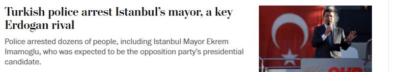 Washington Post, haberinde, “Türk polisi, muhalefet partisinin cumhurbaşkanı aday adayı olan İstanbul Büyükşehir Belediye Başkanı Ekrem İmamoğlu'nun da aralarında bulunduğu onlarca kişiyi gözaltına aldı” ifadelerine yer verildi.