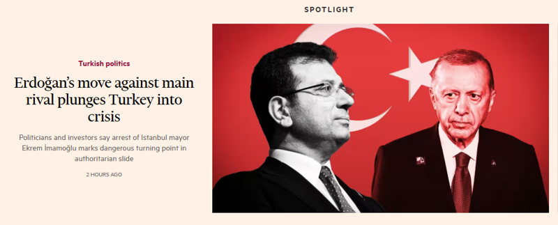 Financial Times, İstanbul Büyükşehir Belediye (İBB) Başkanı Ekrem İmamoğlu'nun gözaltına alınmasını, "Cumhurbaşkanı Recep Tayyip Erdoğan’ın en güçlü rakibi Türk polisi tarafından gözaltına alındı" başlığıyla duyurdu. Haberde, İmamoğlu hakkında yürütülen çeşitli ceza soruşturmalarının çoğunlukla siyasi çıkışlarıyla bağlantılı olduğu belirtilirken, kendisinin hükümeti yargıyı iktidarını koruma aracı olarak kullanmakla suçladığı aktarıldı.