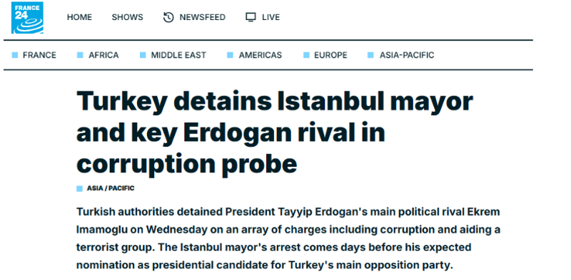 France24, İmamoğlu hakkında verilen gözaltı kararına ilişkin yayınladığı haberinde, “Erdoğan’ın en güçlü adayı gözaltında” denildi.