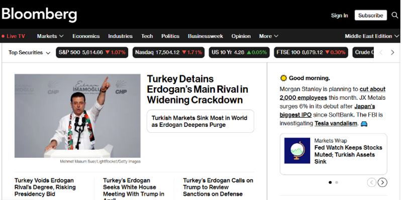 Bloomberg: Amerika Birleşik Devletleri (ABD) merkezli yayın kuruluşu haberinde, "Türkiye'nin muhalif figürlerinden biri olan İmamoğlu, geçen yılki İstanbul belediye başkanlığı yarışında Erdoğan'ın seçtiği adayı yenmesinden bu yana cumhurbaşkanlığı için en önemli aday olarak görülüyor. Pazar günü ana muhalefet partisi Cumhuriyet Halk Partisi'nin cumhurbaşkanı adayı olarak gösterilecekti" ifadelerine yer verildi.
