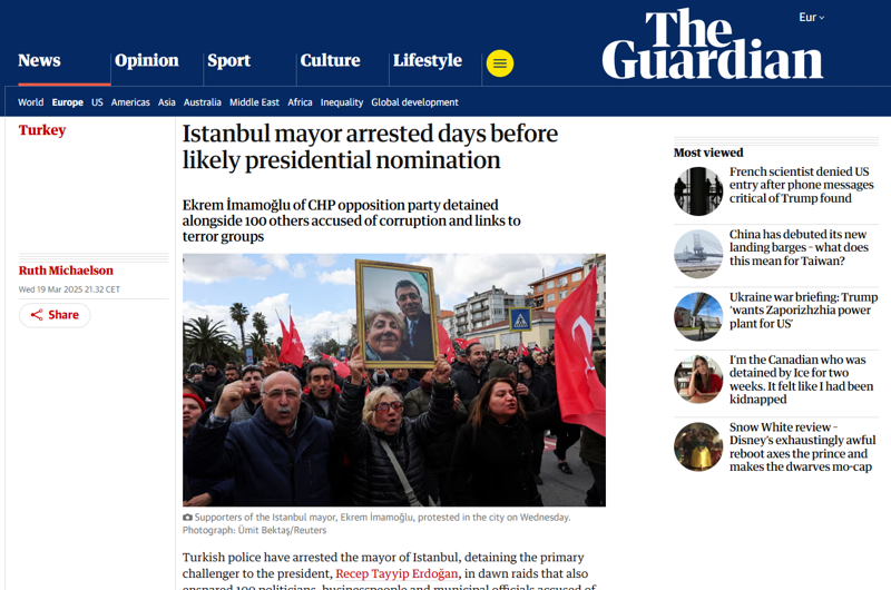 The Guardian, haberinde “CHP'li muhalefet partisi lideri Ekrem İmamoğlu, yolsuzluk ve terör örgütleriyle bağlantıları olduğu iddiasıyla 100 kişiyle birlikte gözaltına alındı” ifadelerine yer verdi.