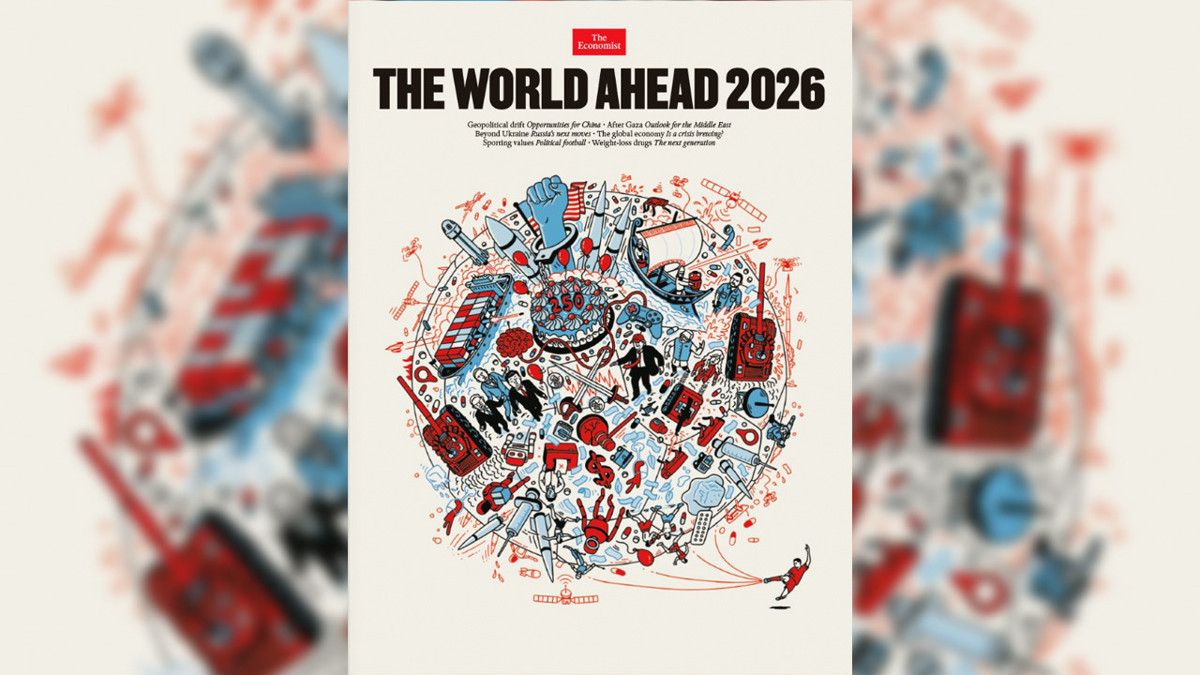 Kapağın merkezinde dev bir küre yer alıyor; savaş, teknoloji, ekonomi ve toplumsal krizler aynı gezegenin üzerinde üst üste bindirilmiş birer iz gibi duruyor. Rusya–Ukrayna savaşı, İsrail-Filistin hattında süren çatışmalar ve Çin’in genişleyen nüfuzu, kırılmış kelepçe, tank, drone, füze ve lider siluetleriyle resmedilirken, The Economist’in 2026 için ana uyarısı açık: jeopolitik belirsizlikler yeni yılın belirleyici unsuru olacak.