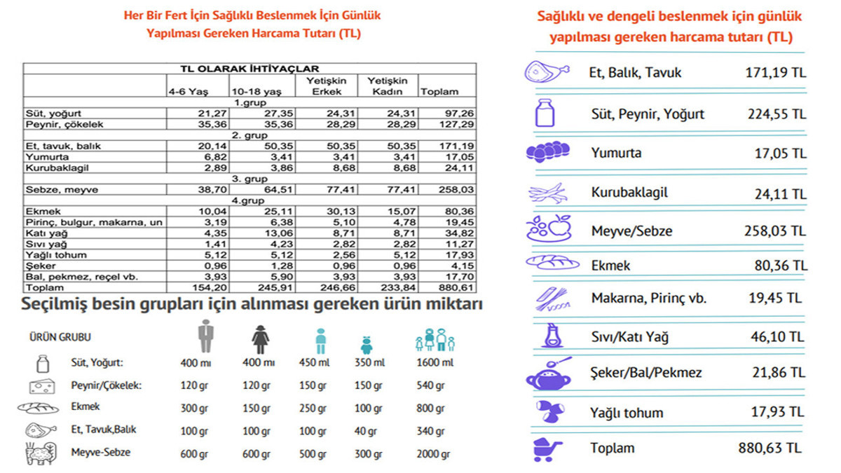 Rapora her aile ferdinin sağlıklı beslenme ihtiyacı ve alması gereken kalori miktarının farklı olduğuna da vurgu yapıldı. Buna bağlı olarak örneğin, ekmek tüketimi erkek ve kadın için değişirken, süt ve süt ürünlerinde 10-18 yaş arası gençlerin gereksinimi yetişkinlerden fazla olduğu belirtildi. Yumurta tüketiminin ise özellikle 4-6 yaş arası çocuklar için daha önemli olduğunun altı çizilerek, bu yaş grubunun tüketmesi gereken yumurta miktarının yetişkinlerden yüksek olduğuna dikkat çekildi.