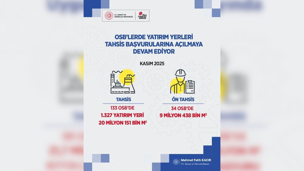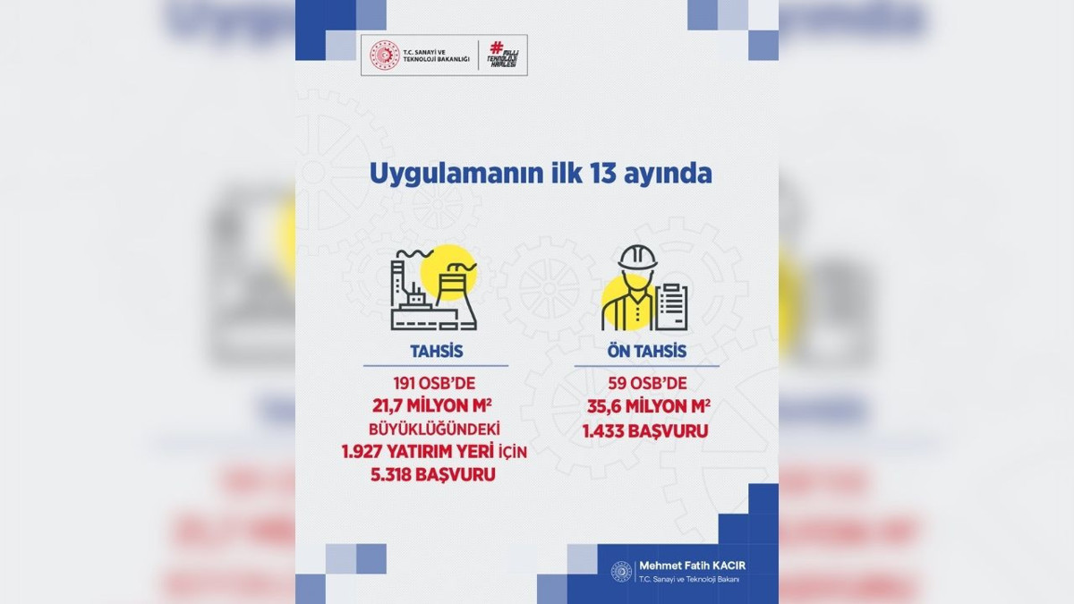 Sanayi ve Teknoloji Bakanı Bakan Mehmet Fatih Kacır, resmi sosyal medya hesabından yaptığı açıklamada, OSB parsellerinin çevrimiçi tahsis uygulamasının başarısını ortaya koyan dikkat çekici veriler paylaştı.