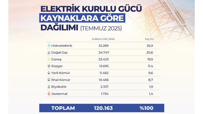 Türkiye, enerji alanında yeni bir eşiği geride bıraktı. Enerji ve Tabii Kaynaklar Bakanlığı, Temmuz 2025 itibarıyla elektrik kurulu gücünün 120 bin megavat sınırını geçtiğini duyurdu.