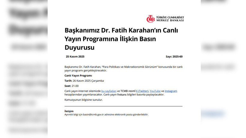 Türkiye Cumhuriyet Merkez Bankası (TCMB), Başkan Fatih Karahan’ın 26 Kasım Çarşamba akşamı “Para Politikası ve Makroekonomik Görünüm” başlıklı bir canlı yayın programına katılacağını duyurdu. Program saat 21.00’de başlayacak.