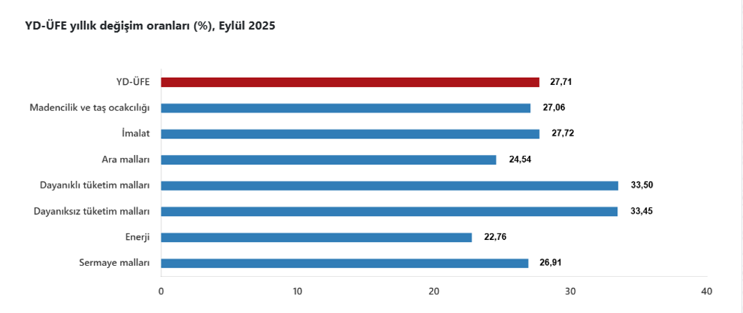 Eylül 2025’te yurt dışına yönelik üretici fiyat endeksi (YD-ÜFE) aylık bazda yüzde 2,01, yıllık bazda ise yüzde 27,71 arttı. En yüksek artış enerjide görülürken, dayanıksız tüketim malları fiyatları da hızla yükseldi.