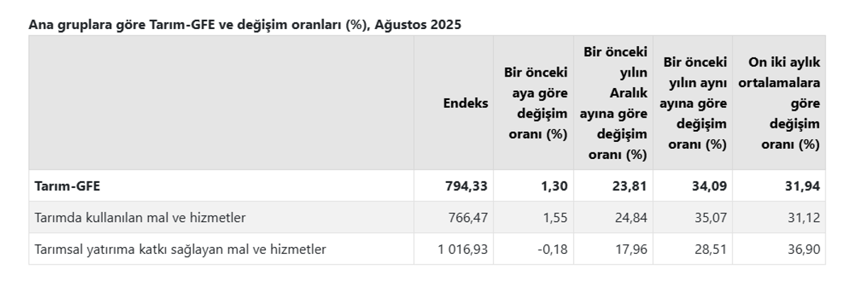 TÜİK verilerine göre tarımsal üretimde maliyet baskısı artmaya devam ediyor. Tarımsal girdi fiyat endeksi ağustos ayında yıllık yüzde 34,09, aylık ise yüzde 1,30 yükseldi. En yüksek artış veteriner harcamaları ve gübre fiyatlarında yaşandı.