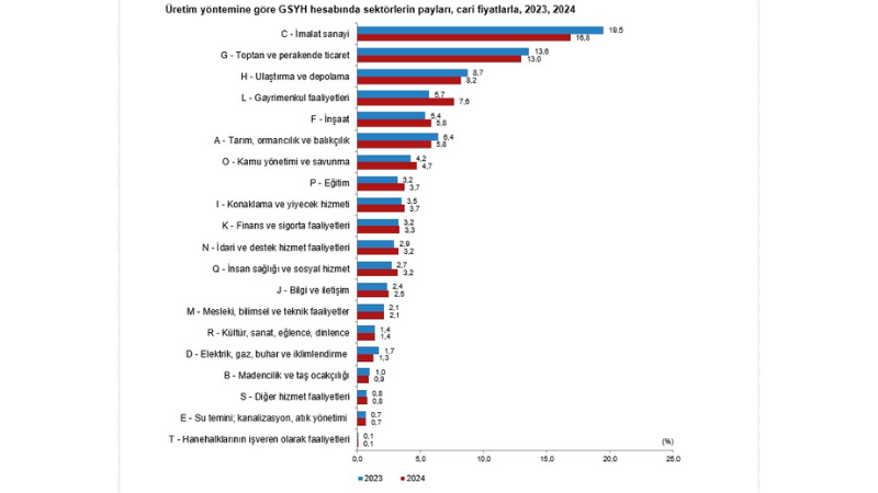Üretim yöntemine göre hesaplanan GSYH, cari fiyatlarla yüzde 64,6 artarak 44 trilyon 587 milyar TL’ye ulaştı. Ekonomide en büyük payı yüzde 16,8 ile imalat sanayi üstlendi. İmalatın ardından yüzde 13’lük oranla ticaret, motorlu taşıt onarımı ve yüzde 8,2 ile ulaştırma sektörü geldi. En düşük katkıyı ise hanehalklarının işveren olarak yürüttüğü faaliyetler yaptı.