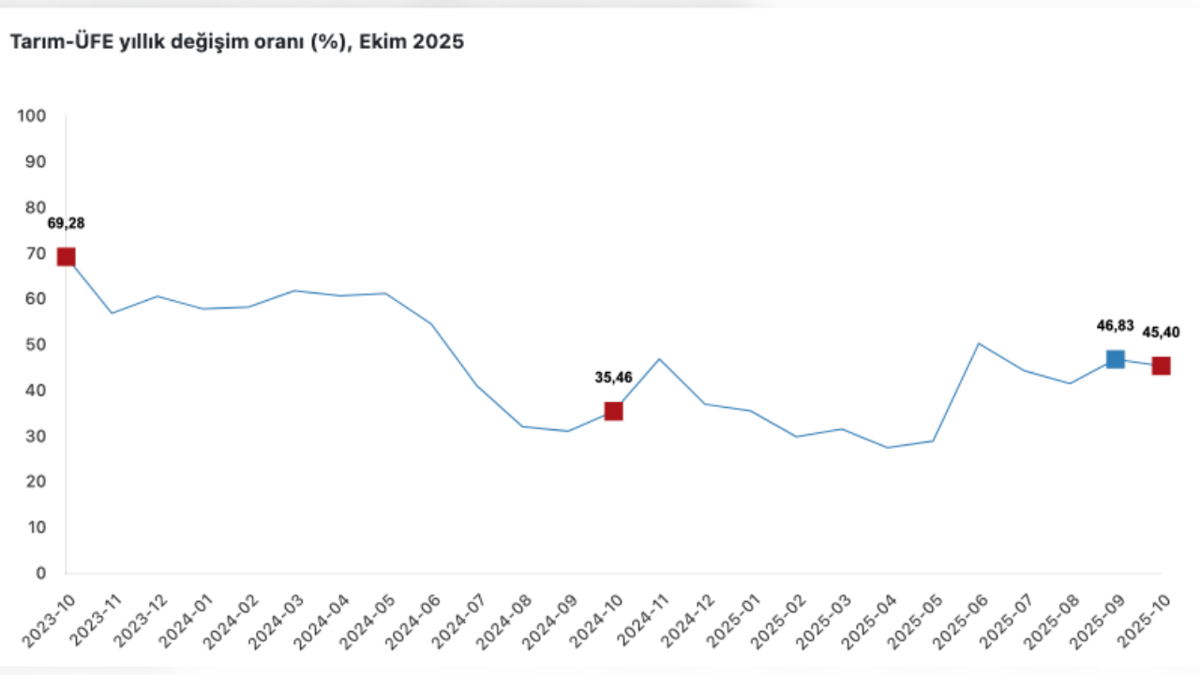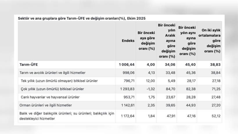 Açıklanan verilere göre Tarım-ÜFE, Ekim ayında bir önceki aya göre yüzde 4,00 artış gösterdi. Yıllık bazda, yani bir önceki yılın aynı ayına göre artış ise yüzde 45,40 seviyesinde gerçekleşti.