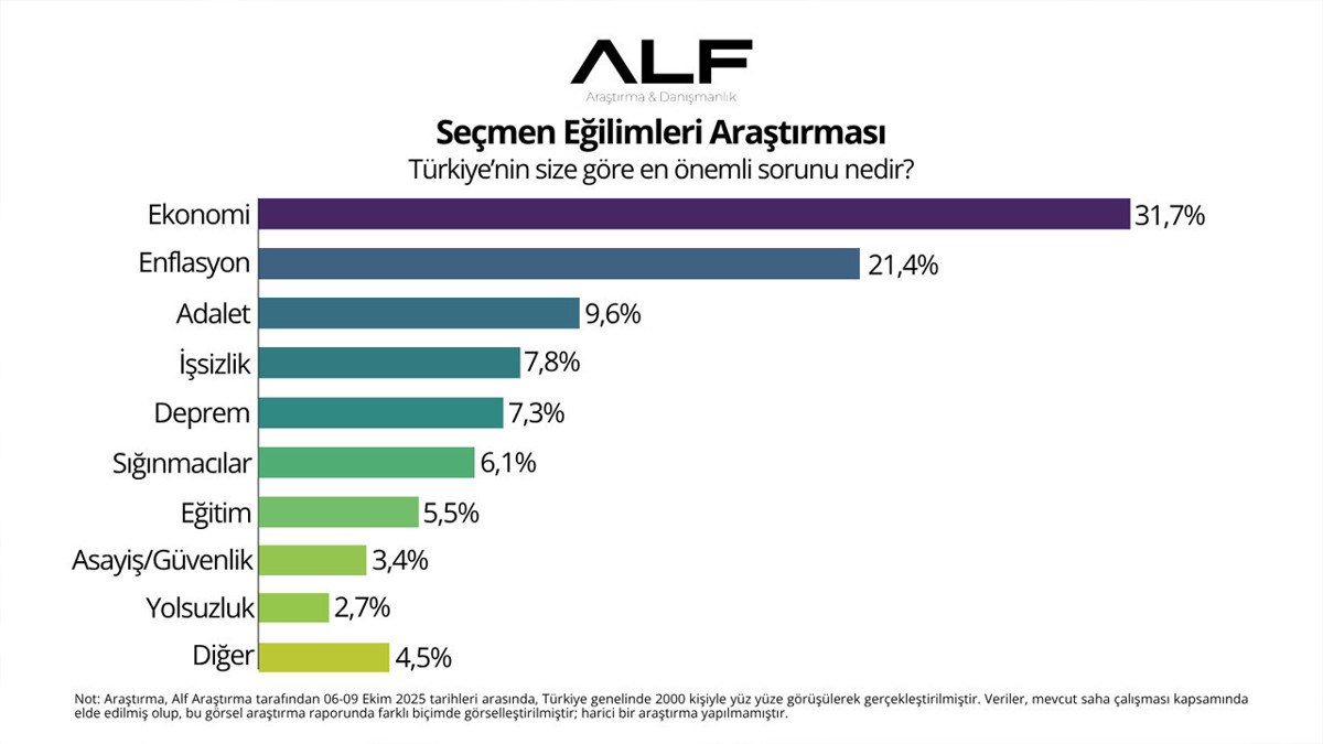 ALF Araştırma tarafından 6-9 Ekim 2025 tarihleri arasında 2 bin kişiyle yüz yüze yapılan "Seçmen Eğilimleri Araştırması", Türkiye'de vatandaşların en önemli gündem maddesinin açık ara farkla ekonomi olduğunu ortaya koydu. Ankete katılanların yarısından fazlası, en önemli sorun olarak doğrudan "ekonomi" veya "enflasyon"u işaret etti.