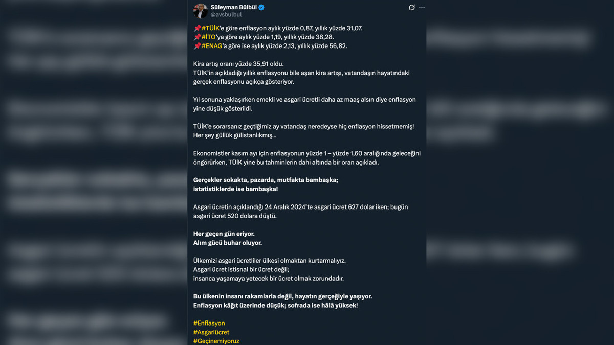"Gerçekler sokakta, pazarda, mutfakta bambaşka; istatistiklerde ise bambaşka!" diyerek sözlerini sürdüren Bülbül, "Asgari ücretin açıklandığı 24 Aralık 2024’te asgari ücret 627 dolar iken; bugün asgari ücret 520 dolara düştü. Her geçen gün eriyor. Alım gücü buhar oluyor. Ülkemizi asgari ücretliler ülkesi olmaktan kurtarmalıyız. Asgari ücret istisnai bir ücret değil; insanca yaşamaya yetecek bir ücret olmak zorundadır. Bu ülkenin insanı rakamlarla değil, hayatın gerçeğiyle yaşıyor. Enflasyon kâğıt üzerinde düşük; sofrada ise hâlâ yüksek!" ifadelerine yer verdi.