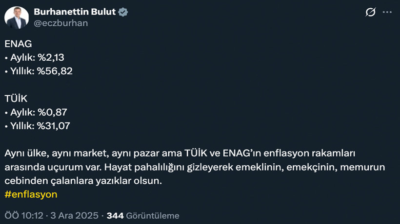 CHP Genel Başkan Yardımcısı Burhanettin Bulut ise kurumlar arasındaki farklılığa ilişkin "Aynı ülke, aynı market, aynı pazar ama TÜİK ve ENAG’ın enflasyon rakamları arasında uçurum var. Hayat pahalılığını gizleyerek emeklinin, emekçinin, memurun cebinden çalanlara yazıklar olsun." diyerek tepki gösterdi.