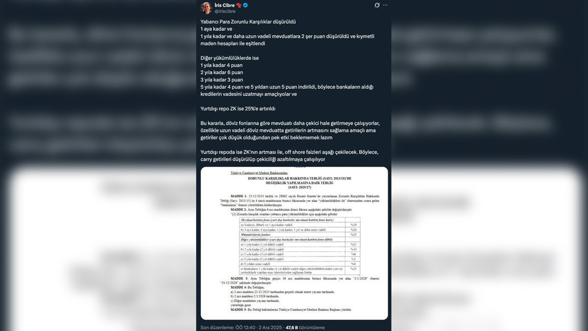 İris Cibre, X’te yaptığı bir başka değerlendirmede zorunlu karşılık düzenlemelerinin genel yönünü özetledi. Cibre, bankaların yabancı para yükümlülüklerinde, özellikle mevduat tarafında farklı vadelerde 2’şer puanlık indirimler yapıldığını; kıymetli maden hesaplarıyla da aynı seviyeye çekildiğini belirtti. Mevduat dışındaki diğer yükümlülüklerde ise vadelere göre 3 ila 6 puan arasında değişen daha belirgin indirimlerin devreye alındığını söyledi. Bu adımların, bankaların kullandıkları kredilerin vadesini uzatmaya yönelik bir teşvik işlevi gördüğünü ifade etti.