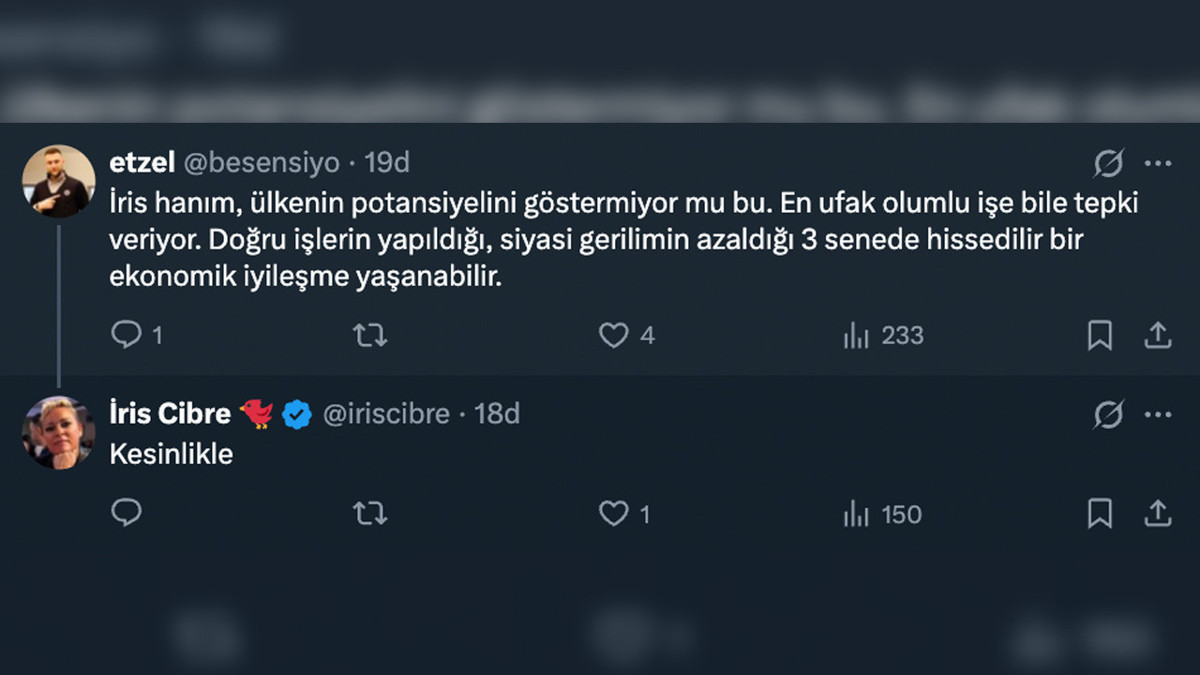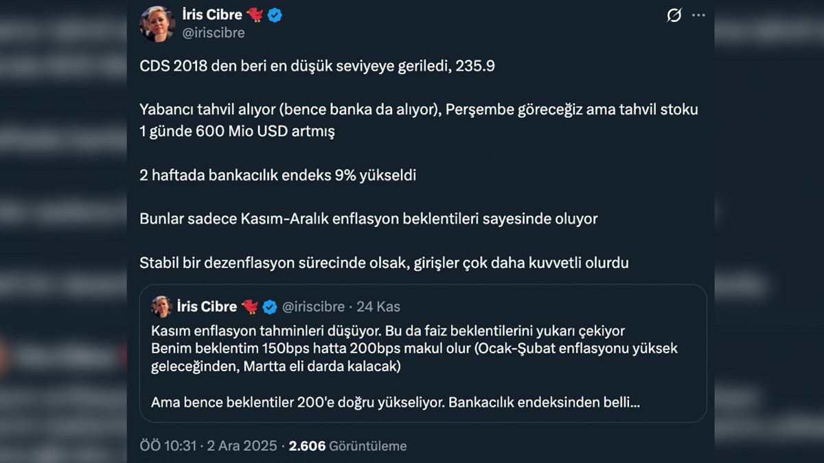 Türkiye’nin dış yatırımcı gözündeki riskini gösteren CDS oranı, 2018’den bu yana en düşük seviyesine gerileyerek 235,9 oldu. Ekonomist İris Cibre’nin değerlendirmesine göre bu düşüş, yabancı yatırımcıların yeniden Türkiye’ye ilgi göstermeye başladığını gösteriyor. Cibre, yalnızca bir günde Türkiye’nin tahvil stokunun 600 milyon dolar arttığını belirtiyor. Bu, yabancıların Türkiye’nin borçlanma kağıtlarını satın aldığı anlamına geliyor. Tahvil alımı, devletin borçlanırken ödediği faizin düşmesine yardımcı oluyor ve ekonomiye güven arttığında yabancı ilgisi büyüyor.