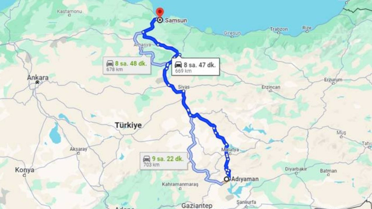 ADIYAMAN SAMSUN ARASI KAÇ KİLOMETRE?