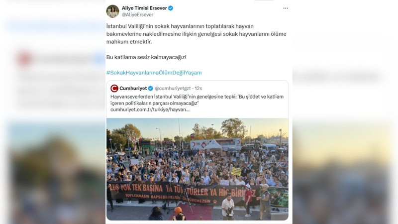 Aliye Timisi Ersever, İstanbul Valiliğinin sokak hayvanlarının toplanarak bakımevlerine gönderilmesine ilişkin genelgesine tepki gösterdi. Ersever, uygulamanın hayvanları ölüme mahkum edeceğini belirterek, “Bu katliama sessiz kalmayacağız.” ifadelerini kullandı.