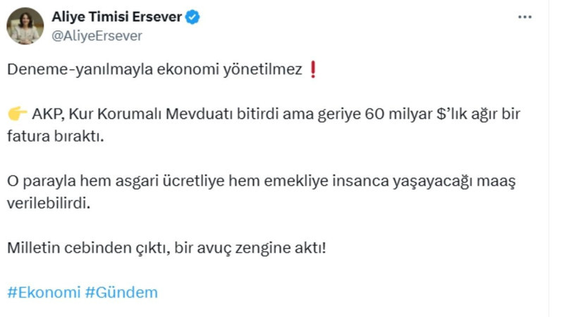 Ekonomi politikalarını da eleştiren Ersever, Kur Korumalı Mevduat’ın bitirilmesinin ardından geride 60 milyar dolarlık ağır bir yük kaldığını iddia etti. Ersever, “O parayla hem asgari ücretliye hem emekliye insanca yaşayacağı maaş verilebilirdi. Milletin cebinden çıktı, bir avuç zengine aktı.” sözleriyle hükümeti eleştirdi.