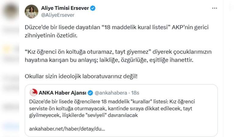 Düzce’de bir lisede yayımlanan “18 maddelik kural listesi”ne de tepki gösteren Ersever, “Kız öğrenci ön koltuğa oturamaz, tayt giyemez.” gibi maddelerin AK Parti’nin gerici zihniyetinin özeti olduğunu söyledi. Ersever, “Çocuklarımızın hayatına karışan bu anlayış; laikliğe, özgürlüğe, eşitliğe ihanettir. Okullar sizin ideolojik laboratuvarınız değil.” dedi.