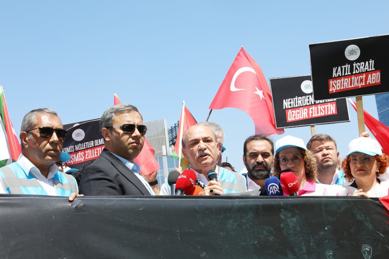Büro Memurları Sendikası (BÜRO MEMUR-SEN), İsrail soykırımına destek veren ve İran'a saldırı düzenleyen ABD'yi protesto etmek amacıyla ABD Büyükelçiliği önünde basın açıklaması yaparak siyah çelenk bıraktı.