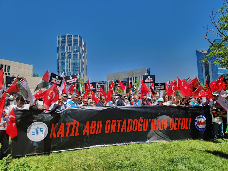 BÜRO MEMUR-SEN ABD'nin İran saldırılarını ve İsrail'e verdiği desteği protesto etmek için ABD'nin Ankara Büyükelçiliği önünde eylem düzenlendi. BÜRO MEMUR-SEN Başkanı Yazgan, "Emperyalist Amerika’nın, yıllardır Ortadoğu coğrafyasında kurduğu kanlı senaryolar artık gizlenemez hale gelmiştir" dedi.