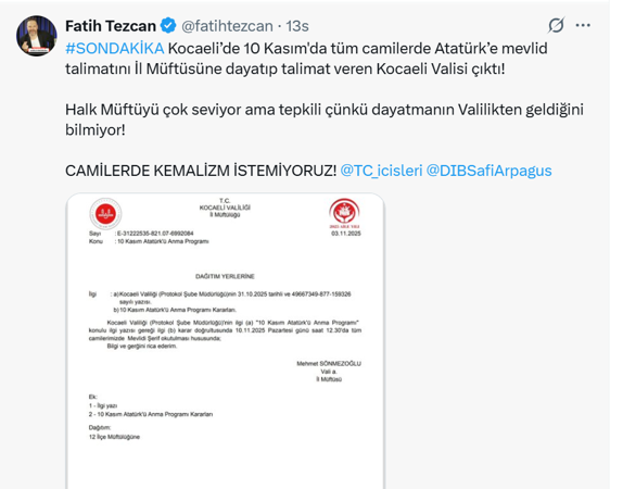 Yayıncı Fatih Tezcan, sosyal medya hesabından yaptığı paylaşımda, talimatın kaynağını, "Kocaeli’de 10 Kasım'da tüm camilerde Atatürk’e mevlid talimatını İl Müftüsüne dayatıp talimat veren Kocaeli Valisi çıktı! Halk Müftüyü çok seviyor ama tepkili çünkü dayatmanın Valilikten geldiğini bilmiyor! CAMİLERDE KEMALİZM İSTEMİYORUZ!" sözleriyle Kocaeli Valisi'ne dayandırdı. Tezcan'ın bu paylaşımı, kısa sürede yüksek etkileşim alarak tartışmanın fitilini ateşledi. Bir kısım kullanıcı Tezcan'a destek verirken, diğer bir kısım ise kararı savundu.