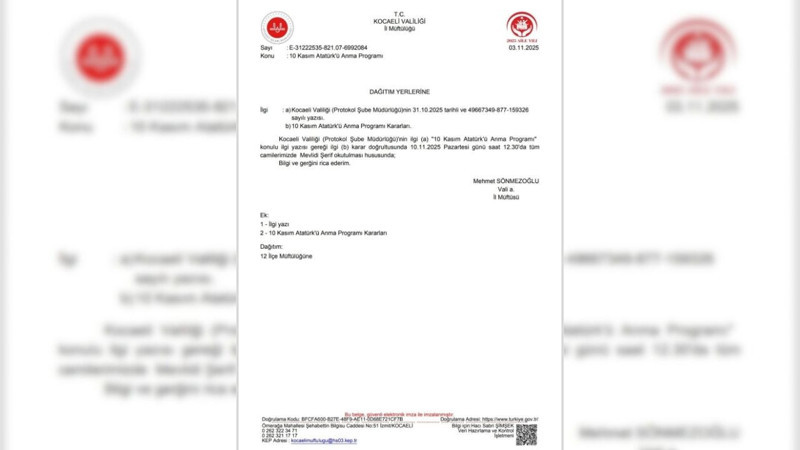 Kocaeli İl Müftüsü Mehmet Sönmezoğlu imzasıyla 03.11.2025 tarihli ve Valiliğin bir önceki tarihli yazısına atıfta bulunan belge, 10 Kasım Pazartesi günü saat 12.30'da tüm camilerde Mevlid-i Şerif okutulması hususunda bilgi ve gereği rica ediyor. Ancak bu talimatın kamuoyuna yansımasıyla birlikte, özellikle sosyal medya üzerinden birbirine zıt görüşler karşı karşıya geldi.