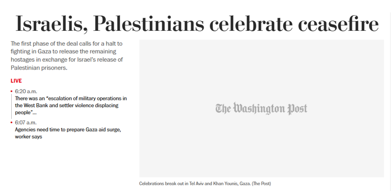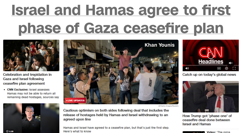 ABD Kanada merkezli CNN ise Gazze haberini manşetten verdi. Haberde iki tarafın vatandaşlarının kutlama yaptığı görüntülere yer veren CNN haberinde, "Her iki taraf da, Hamas’ın elindeki rehinelerin serbest bırakılmasını ve İsrail’in belirlenen hatlara çekilmesini öngören anlaşmanın ardından temkinli davranıyor" ifadeleri yer aldı.