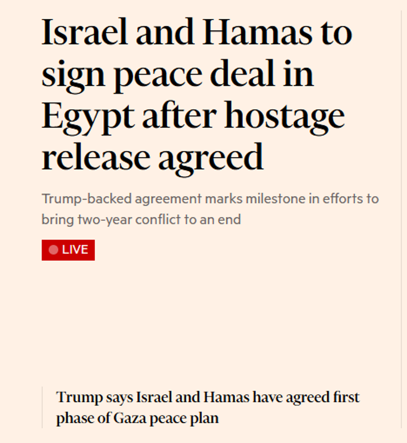 İngiliz merkezli ekonomi ve iş gazetesi Financial Times ise manşetten gördüğü haberinde, "Trump, İsrail ve Hamas'ın anlaşmanın ilk aşamasını kabul etti" dedi.