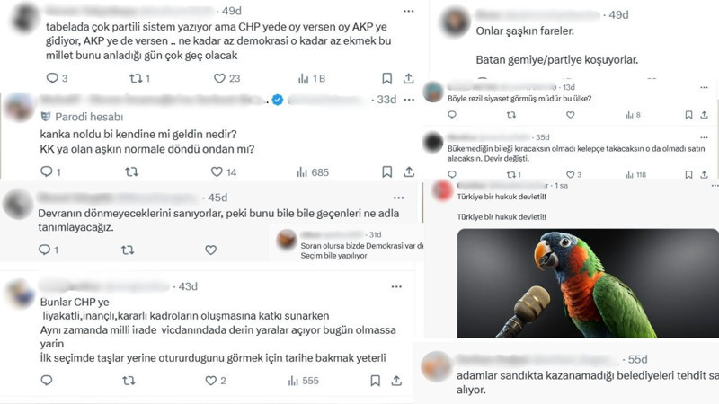 Diğer yorumlarda ise seçim sonuçları ve siyasi stratejiler ele alındı: “Bükemediğin bileği kıracaksın, olmadı kelepçe takacaksın, o da olmadı satın alacaksın. Devir değişti.” ve “Adamlar sandıkta kazanamadığı belediyeleri tehdit, şantaj ve kumpasla alıyor.” yorumları öne çıktı.