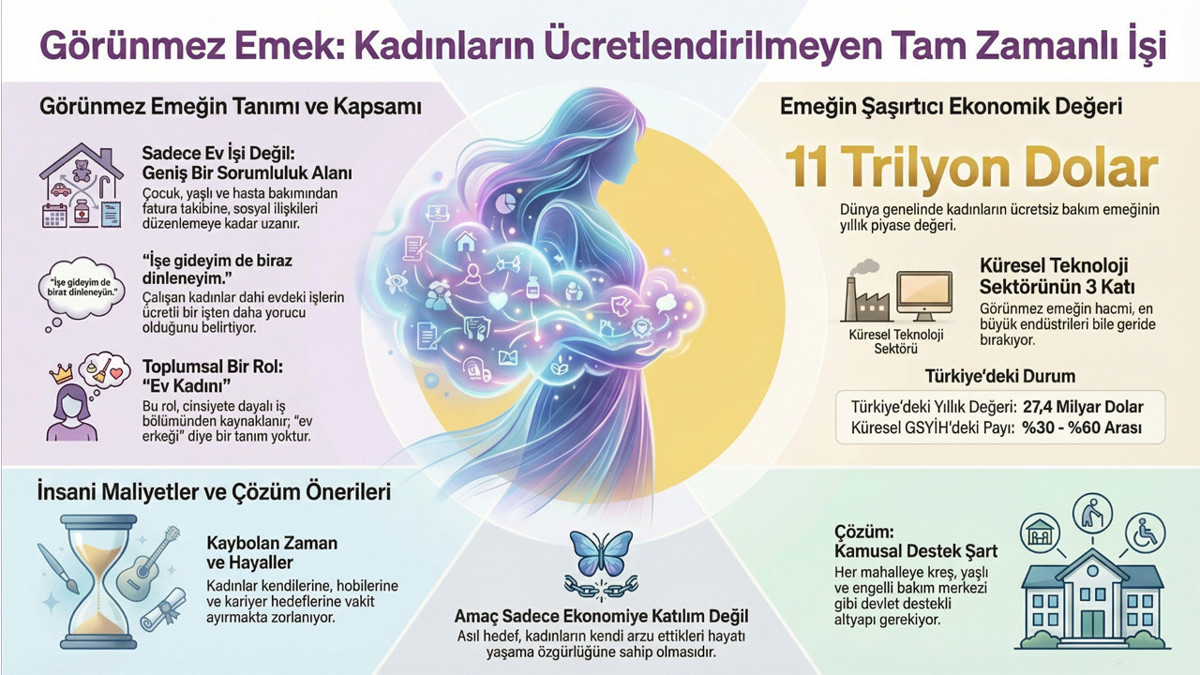 Videoda görüşlerini paylaşan kadınlar, “Ne iş yapıyorsun?” sorusuna çoğu zaman “Hiçbir şey” diye cevap verdiklerini, ancak gerçekliğin bunun tam tersi olduğunu anlatıyor. Çocuk bakımı, yaşlı bakımı, temizlik, yemek, faturalar, evin duygusal yükü, ilişkileri düzenleme, hatta mahalle içi dayanışma… Tüm bu faaliyetler, gayrisafi yurtiçi hasılanın yüzde 30–60’ına denk gelecek büyüklükte bir karşılıksız emek anlamına geliyor.
