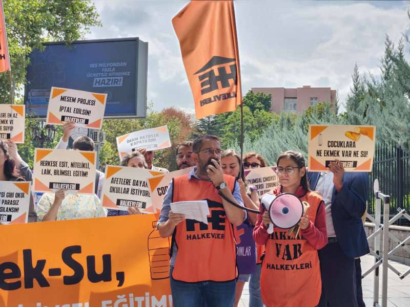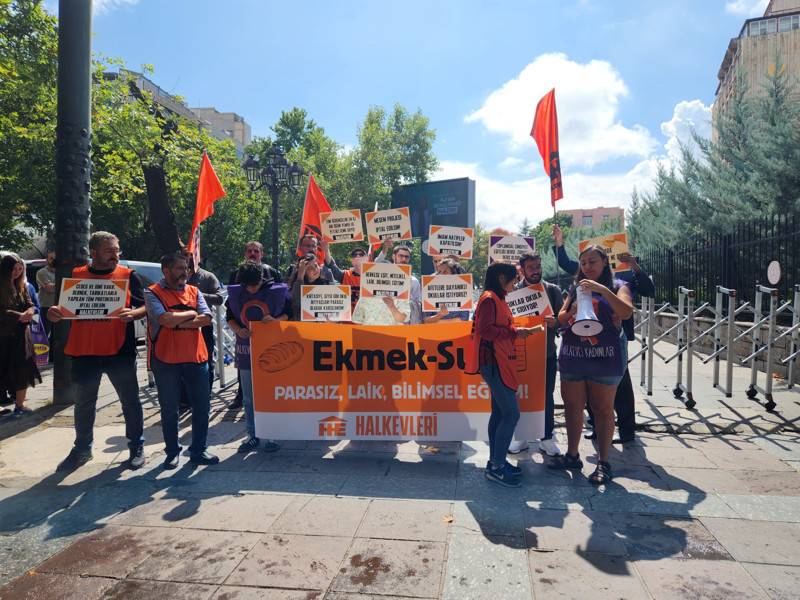 Halkevleri, 2025-2026 eğitim-öğretim yılı öncesi MEB önünde basın açıklaması yaptı. Üyeler, okula başlama maliyetlerinin yüzde 56 arttığını, her beş öğrenciden birinin aç okula gittiğini belirterek, parasız, laik ve bilimsel eğitim talep etti.
