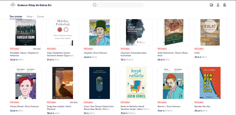 Bu kitap kahve evinde, sadece mekanda hizmetle sınırlı kalmıyor. Kafenin internet üzerindeki alışveriş sayfasında çocuk kitaplarından yetişkinlerin tercih edebileceği okuma kitapları da sipariş edilebiliyor. Kitapseverler için bu kafede internet üzerindeki alışveriş sayfasında çocuk kitaplarından, genç ve yetişkinlerin ilgiyle okuyabileceği roman, hikâye gibi kitap seçenekleri bulunuyor. Enderun Kitap Kahve Evi, hem kahve tadını hem de kitap dünyasını bir arada sunuyor.