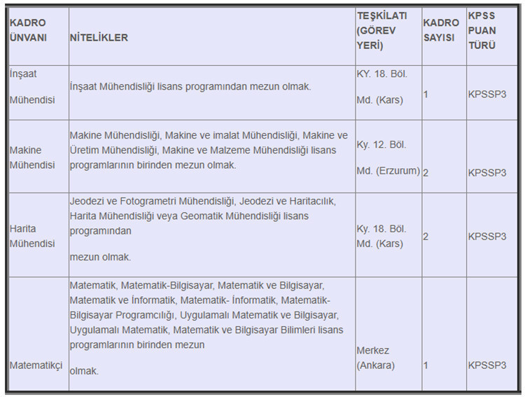 Helal Akreditasyon Kurumu (HAK), merkez teşkilatında görevlendirilmek üzere toplam 3 Helal Akreditasyon Uzman Yardımcısı ve Karayolları Genel Müdürlüğü (KGM), Merkez ve Taşra teşkilatlarında istihdam edilmek üzere teknik personel alımı gerçekleştirecek.